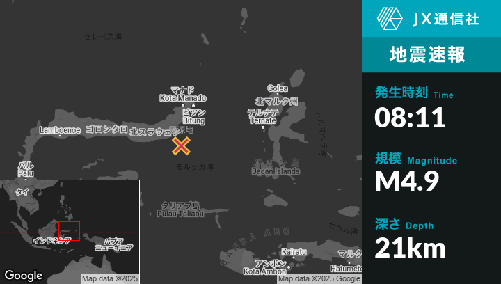 2月26日 08:11頃、インドネシアのModisiから東南東42kmの地点でM4.9の地震がありました。