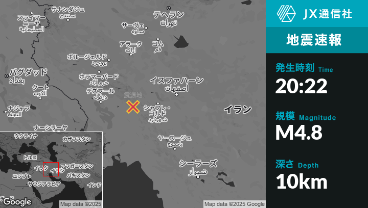 2月26日 20:22頃、イランのMasjed Soleymānから北東60kmの地点でM4.8の地震がありました。