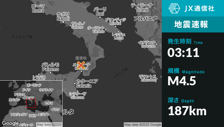 | 震源地 | イタリアのSan Nicolòから西30kmの地点 |