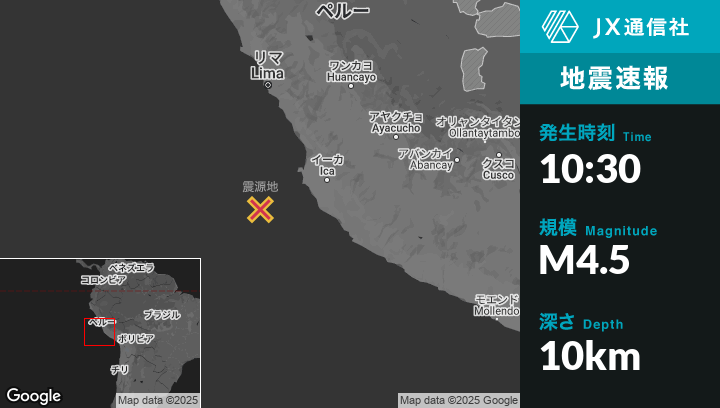 2月27日 10:30頃、ペルーのParacasから南西129kmの地点でM4.5の地震がありました。