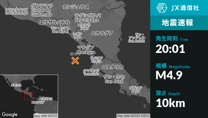 | 震源地 | ニカラグアのMasachapaから南西103kmの地点 |