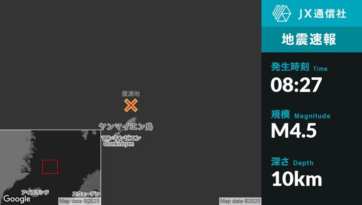 | 震源地 | スヴァールバル諸島とヤンマイエン島のOlonkinbyenから北北東52kmの地点 |