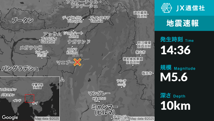 3月05日 14:36頃、インドのYairipokから東44kmの地点でM5.6の地震がありました。