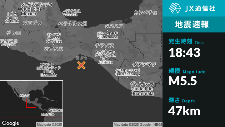 | 震源地 | メキシコのSan Mateo del Marから南南東53kmの地点 |