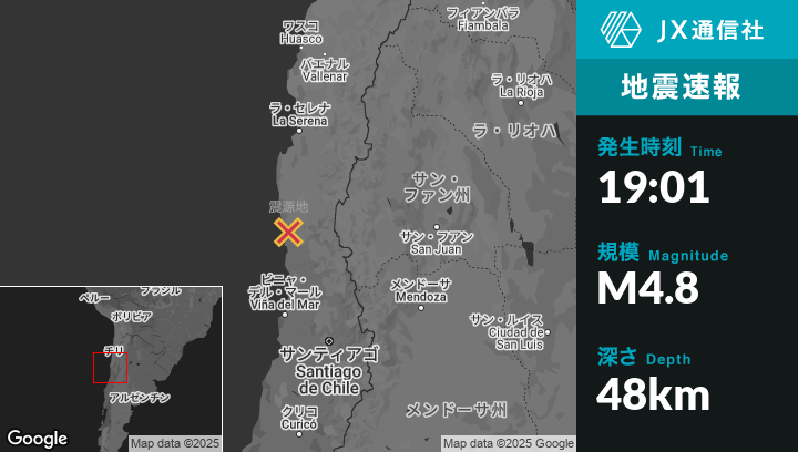 3月05日 19:01頃、チリのIllapelから西北西32kmの地点でM4.8の地震がありました。
