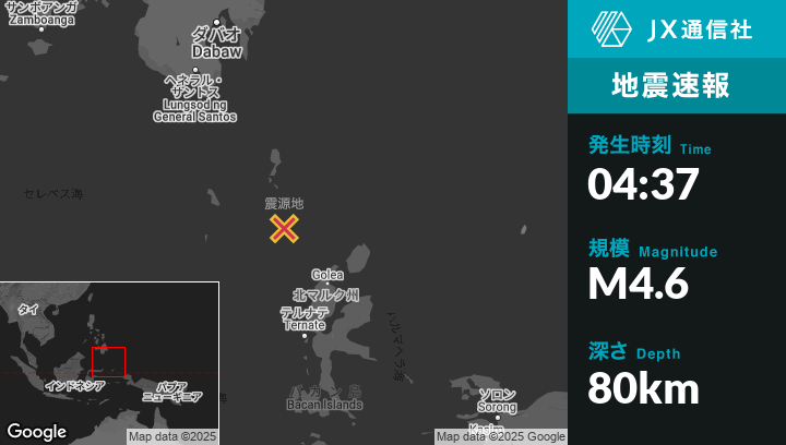 | 震源地 | インドネシアのTobeloから北西188kmの地点 |