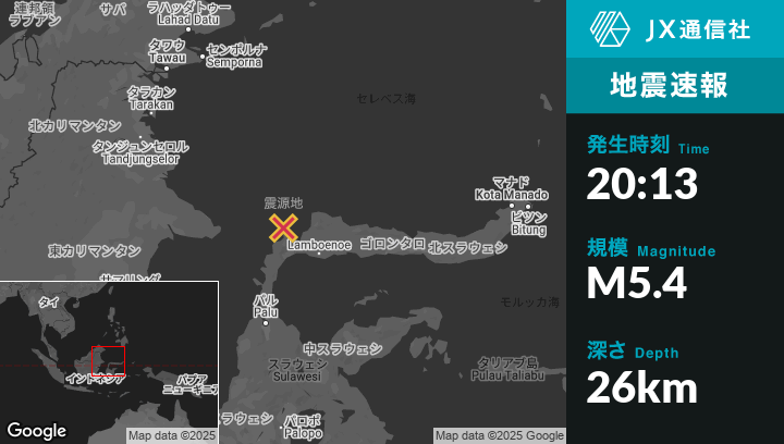 | 震源地 | インドネシアのPaluから北229kmの地点 |