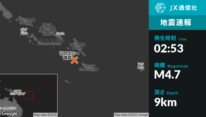 | 震源地 | ソロモン諸島のHoniaraから東南東96kmの地点 |