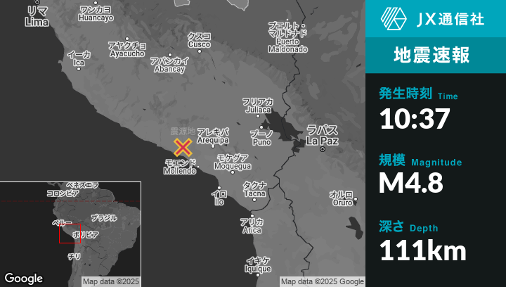 4月04日 10:37頃、ペルーのEl Pedregalから西31kmの地点でM4.8の地震がありました。