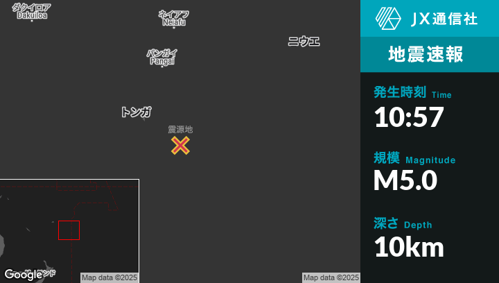 | 震源地 | トンガの‘Ohonuaから東南東143kmの地点 |