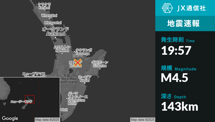 4月06日 19:57頃、ニュージーランドのOhinemutuから南東13kmの地点でM4.5の地震がありました。