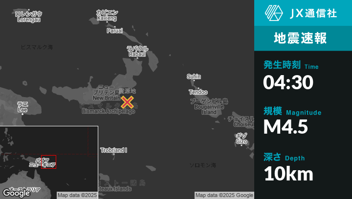 4月07日 04:30頃、パプアニューギニアのKimbeから東南東182kmの地点でM4.5の地震がありました。