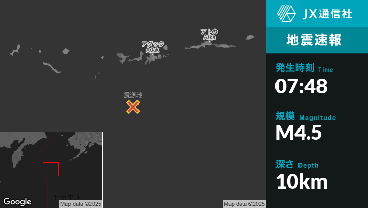 4月08日 07:48頃、アラスカのAdakから南南西161kmの地点でM4.5の地震がありました。