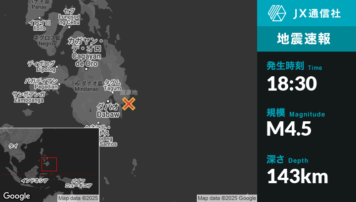 4月08日 18:30頃、フィリピンのSan Ignacioから南南東5kmの地点でM4.5の地震がありました。