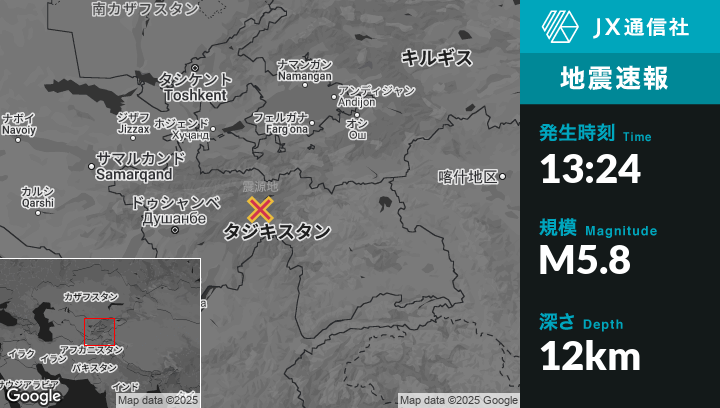 4月13日 13:24頃、タジキスタンのRashtから東25kmの地点でM5.8の地震がありました。