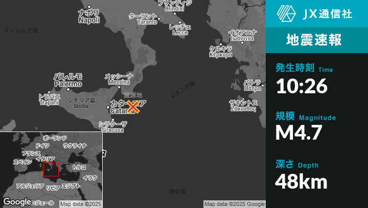 4月16日 10:26頃、イタリアのPalizzi Marinaから南南東37kmの地点でM4.7の地震がありました。