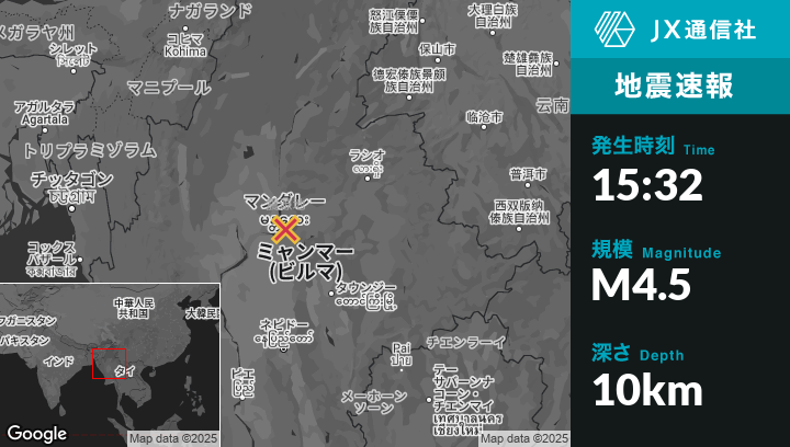 4月17日 15:32頃、ビルマ(ミャンマー)のMandalayから北14kmの地点でM4.5の地震がありました。