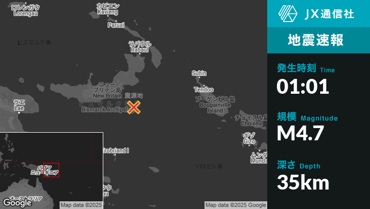 4月18日 01:01頃、パプアニューギニアのKimbeから東南東213kmの地点でM4.7の地震がありました。