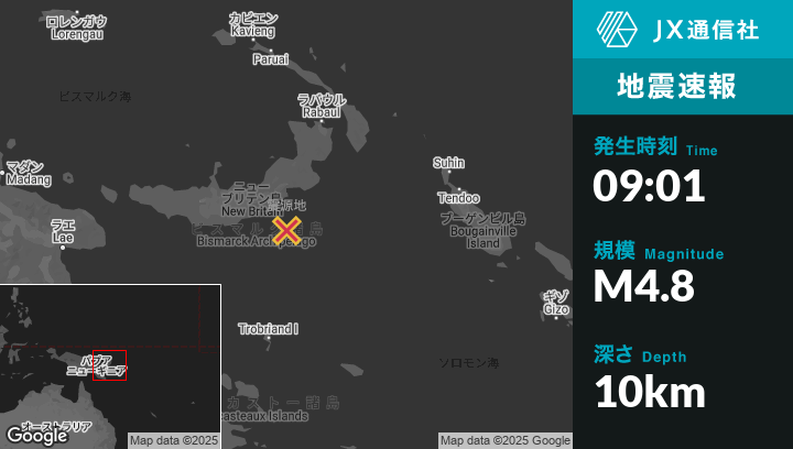 | 震源地 | パプアニューギニアのKimbeから東南東164kmの地点 |