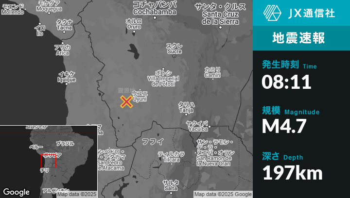 | 震源地 | ボリビアのUyuniから南西77kmの地点 |