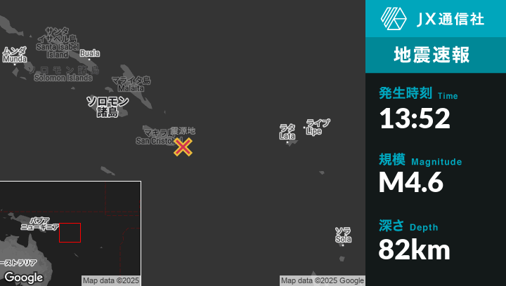 5月30日 13:52頃、ソロモン諸島のKirakiraから東南東74kmの地点でM4.6の地震がありました。