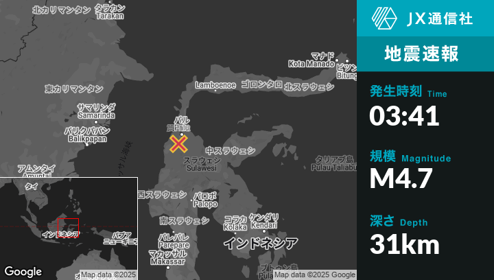 6月01日 03:41頃、インドネシアのPaluから南南西21kmの地点でM4.7の地震がありました。