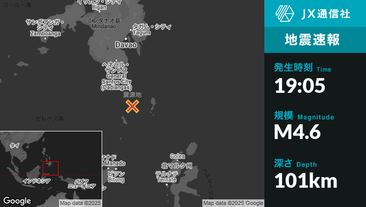 | 震源地 | フィリピンのSaranganiから南南東132kmの地点 |