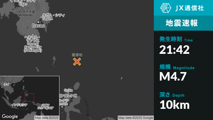 6月06日 21:42頃、インドネシアのTobeloから北285kmの地点でM4.7の地震がありました。