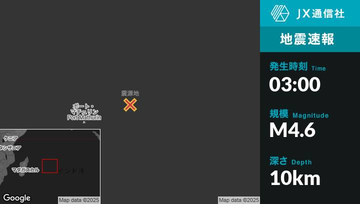 | 震源地 | モーリシャスのPort Mathurinから東北東230kmの地点 |