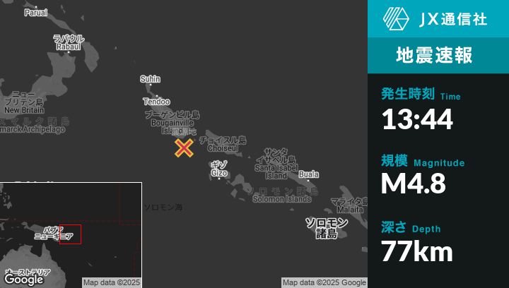 6月07日 13:44頃、パプアニューギニアのPangunaから南南東83kmの地点でM4.8の地震がありました。