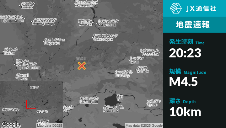 6月12日 20:23頃、ロシアのSut-Khol’から北西77kmの地点でM4.5の地震がありました。