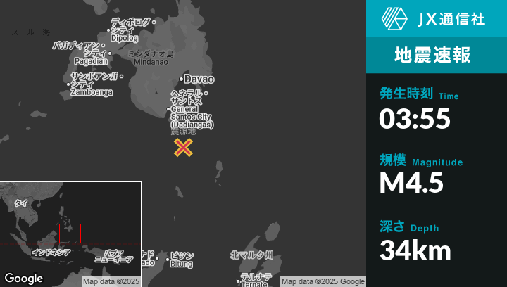 6月13日 03:55頃、フィリピンのSaranganiから南南東43kmの地点でM4.5の地震がありました。