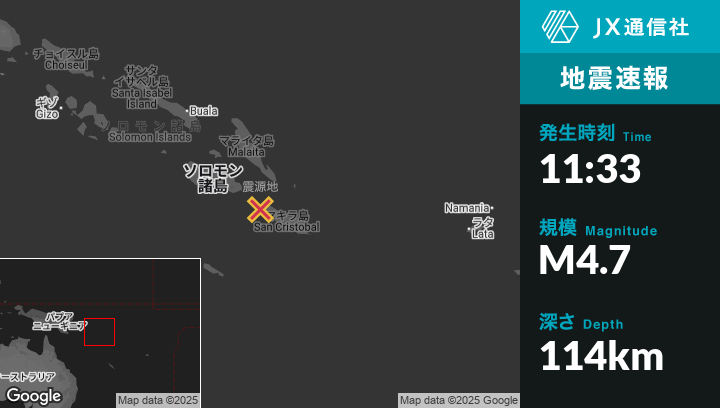 6月13日 11:33頃、ソロモン諸島のKirakiraから西北西82kmの地点でM4.7の地震がありました。