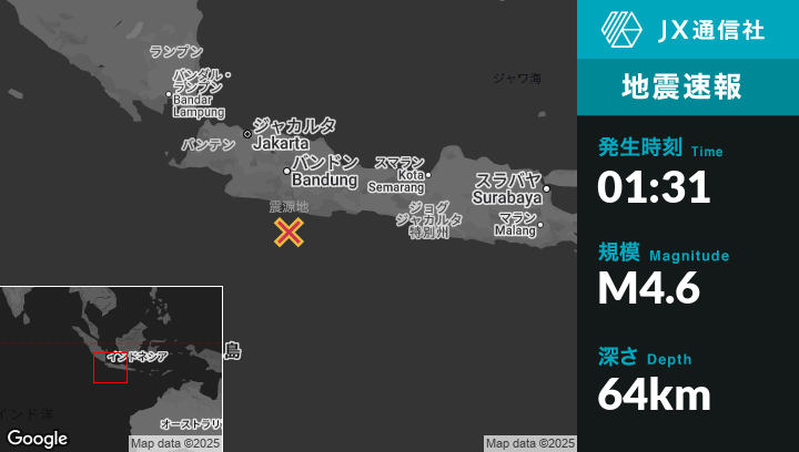 | 震源地 | インドネシアのSingaparnaから南西87kmの地点 |