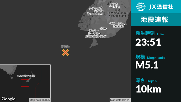 | 震源地 | ニュージーランドのRivertonから西南西238kmの地点 |