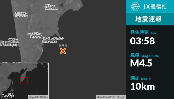 | 震源地 | ロシアのPetropavlovsk-Kamchatskyから東南東134kmの地点 |