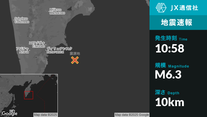 | 震源地 | ロシアのPetropavlovsk-Kamchatskyから東南東144kmの地点 |
