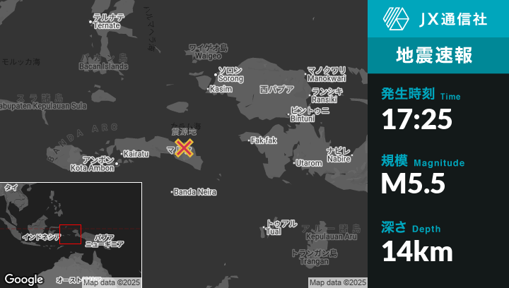 7月23日 17:25頃、インドネシアのMasohiから東北東148kmの地点でM5.5の地震がありました。
