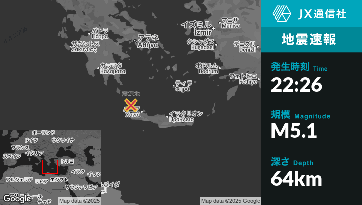| 震源地 | ギリシャのKíssamosから北北西40kmの地点 |