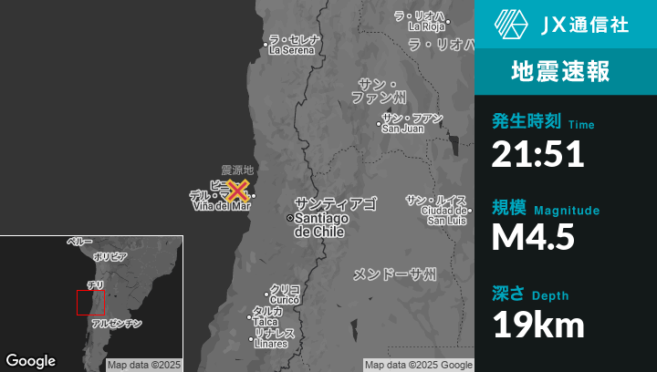 7月27日 21:51頃、チリのValparaísoから北西38kmの地点でM4.5の地震がありました。