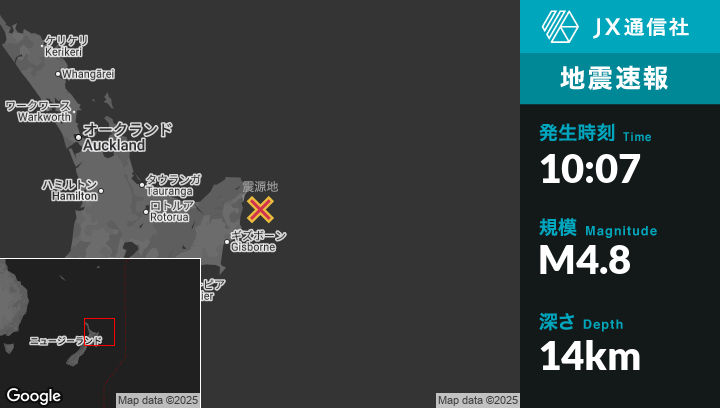 | 震源地 | ニュージーランドのHicks Bayから南東60kmの地点 |