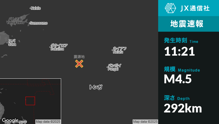 | 震源地 | トンガのPangaiから西215kmの地点 |