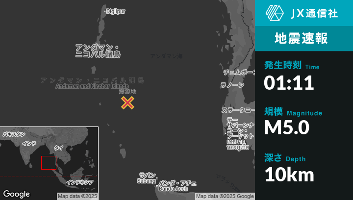 7月30日 01:11頃、インドのPort Blairから南南東288kmの地点でM5.0の地震がありました。