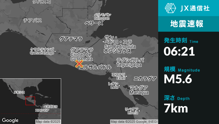7月30日 06:21頃、グアテマラのJerezから西北西3kmの地点でM5.6の地震がありました。