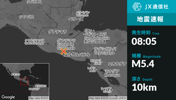 7月30日 08:05頃、グアテマラのZapotitlánから西0kmの地点でM5.4の地震がありました。