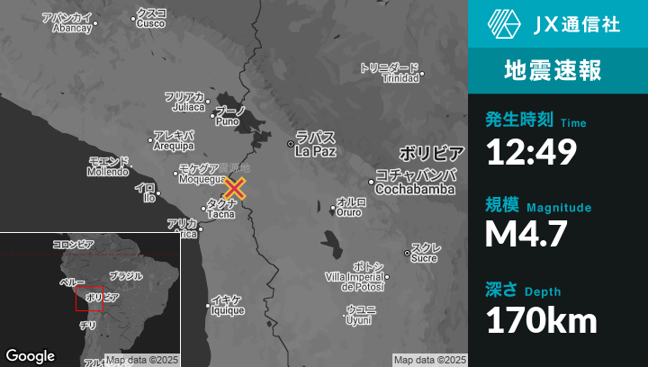 7月30日 12:49頃、ペルーのEstiqueから東北東57kmの地点でM4.7の地震がありました。