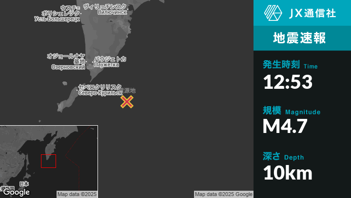 | 震源地 | ロシアのSevero-Kuril’skから東159kmの地点 |