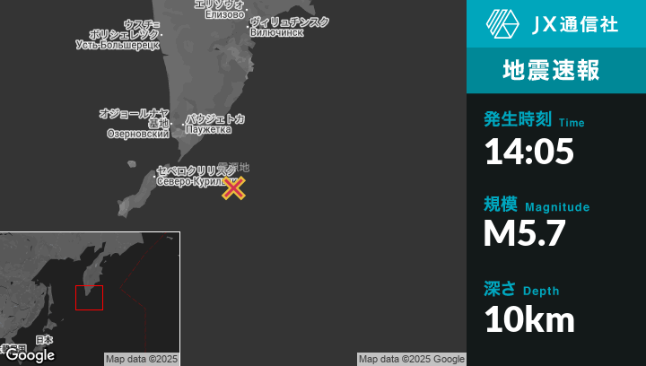 | 震源地 | ロシアのSevero-Kuril’skから東136kmの地点 |