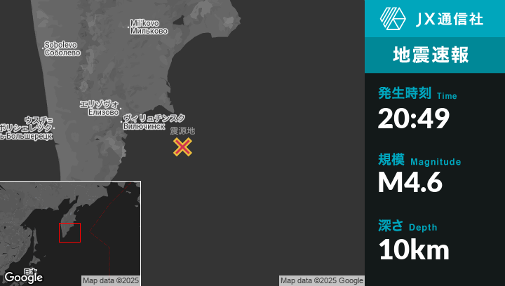 | 震源地 | ロシアのPetropavlovsk-Kamchatskyから東南東127kmの地点 |
