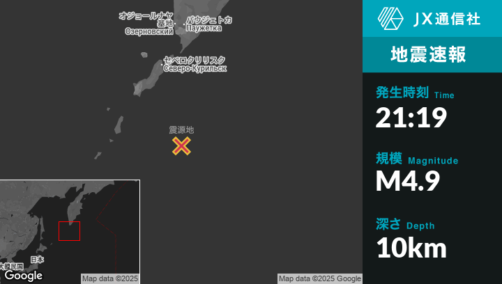 7月30日 21:19頃、ロシアのSevero-Kuril’skから南南東180kmの地点でM4.9の地震がありました。